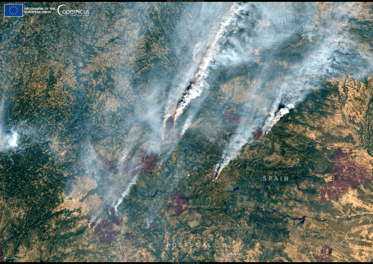 Op 20 augustus verkoos Copernicus een Sentinel-2-opname van 16 augustus van de bosbranden in Noordwest-Spanje tot ‘beeld van de dag’. Het toont laat dikke rookpluimen boven Ourense in Galicië, waar meerdere branden actief zijn. In totaal is dit jaar in Spanje al 403.000 hectare verbrand, waarvan het grootste deel in de afgelopen vijftien dagen.