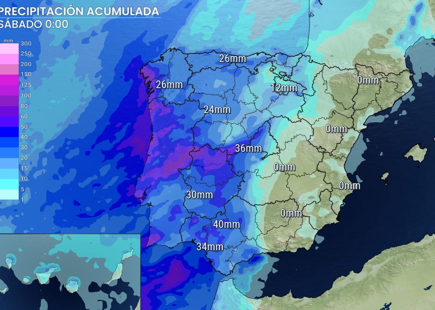Tot en met zaterdag kunnen sommige gebieden aan de Atlantische kust tot meer dan 100 mm aan totale neerslaghoeveelheden verwachten, met sneeuw op hogere plekken in het Cantabrisch gebergte. Ook op het vakantie-eiland Mallorca kunnen de hoogste toppen tijdelijk wit kleuren.