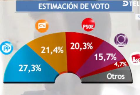 De peiling werd uitgevoerd door bureau Sigma Dos in opdracht van de televisiezender Telecinco. Het percentage geschatte stemmen voor de PP bedraagt 27,3% (112-115 zetels), dat voor Ciudadanos is 21,4% (77-79 zetels), PSOE 20,3% (73-75 zetels) en Podemos 15,7% (42-44 zetels).