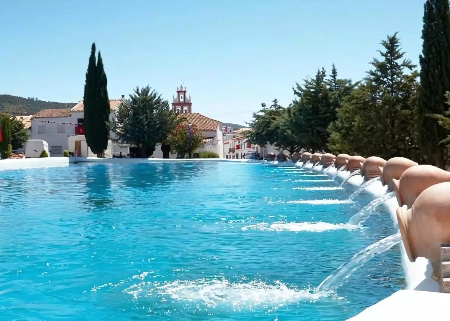Wat dit dorpsplein of zwembad zo bijzonder maakt, is de combinatie van traditie, verkoeling en landschap. Omgeven door witgekalkte huizen, met de glooiende met kastanjes en steeneiken begroeide heuvels van de Sierra de Aracena op de achtergrond, voelt het alsof je in een levend schilderij zwemt.