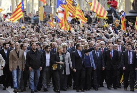 De circa vijfduizend mensen zwaaiden met Catalaanse onafhankelijkheidsvlaggen. Ongeveer 400 burgemeesters en politici die voor een onafhankelijk Catalonië zijn, namen deel en liepen voorop in de demonstratie. Men riep ‘onafhankelijkheid, onafhankelijkheid’ en ‘deze rechtbank vertegenwoordigt ons niet’, terwijl de premier op de trappen van de rechtbank stopte om de mensenmassa te groeten.