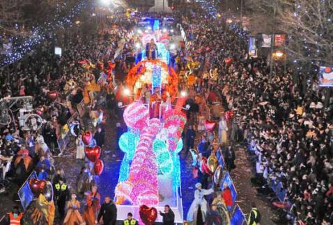 In de optocht die in elke plaats van enig formaat zo’n beetje wordt georganiseerd, hebben de koningen zelf (Caspar, Melchior en Baltasar) elk een eigen uitbundig versierde praalwagen van waaraf ze het publiek toewuiven en er een voortdurende regen van snoepjes op neer laten dalen.