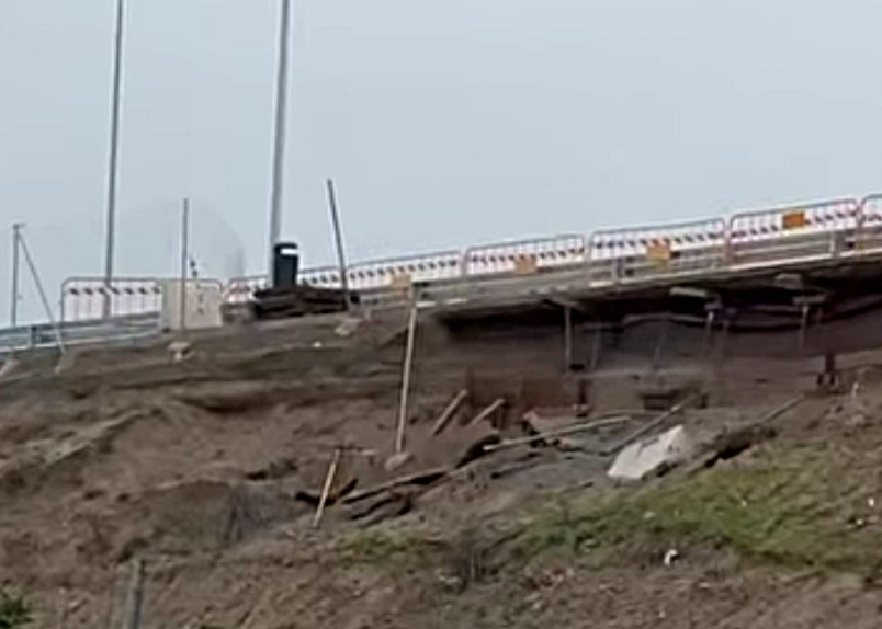 Het gaat om het nieuwe brugdek over de oude N‑V (hoofdweg tussen Madrid en Portugal via Badajoz). Door de laatste regen- en onweersbuien ontstond er volgens lokale berichten een holte onder de fundering, waarna een deel van de constructie moest worden afgestut. De brug ligt precies boven de spoorlijn. Adif voerde de werken aan de brug uit in oktober 2023, nadat het oude brugdeel eerder was afgebroken. In het filmpje is te zien hoe verkeer nog steeds gebruik maakt van de weg.