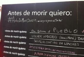 Het schoolbord op het plein is ruim 20 vierkante meter groot. Iedereen wordt uitgenodigd hierop zijn persoonlijke wens te schrijven. Bijdrages kunnen ook via Facebook en Twitter verstuurd worden via #AntesDeMorirQuiero (Voordat ik sterf wil ik…). De organisatie zorgt er dan voor dat ze op het bord worden toegevoegd. De actie loopt nog tot aanstaande zondag.