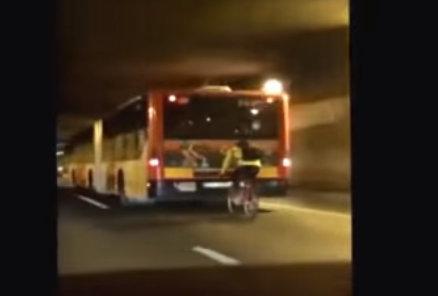 In de video (ook te zien op deze pagina) zien we de fietser in een tunnel vrijwel vastgeplakt aan de achterkant van de bus op extreem hoge snelheid trappen. Het schijnt een vaker voorkomende bezigheid te zijn van fietsers die door gebruik te maken van de slipstream hun reistijd wat willen verkorten, voor de kick of als ze te lui zijn om zelf snelheid te maken.
