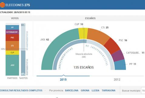 /Op basis van een meerderheid aan parlementszetels willen de nationalisten de ingeslagen weg naar onafhankelijkheid van Spanje voortzetten. Officieel werden op 27 september de regionale parlementsverkiezingen gehouden. De partijen die een onafhankelijk Catalonië nastreven, onder aanvoering van de huidige minister-president Artur Mas hebben van de regionale parlementsverkiezingen een referendum over onafhankelijkheid gemaakt. Junts pel Sí kan samen met de andere nationalistische partij CUP een meerderheid in het parlement behalen.