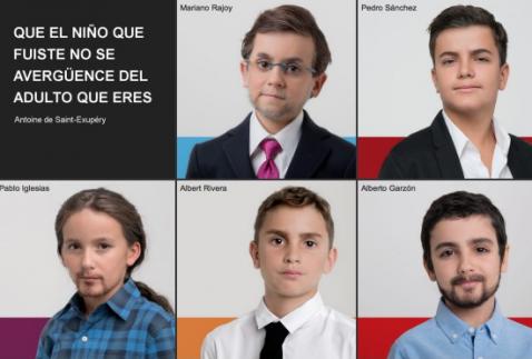 De mini-me’s van de partijleiders vertonen een treffende gelijkenis en per politicus staat een uitspraak die ze als kind gedaan zouden kunnen hebben. Zo zegt Mariano Rajoy: ‘Als ik premier zou zijn, zou ik de stranden van Galicië beschermen’. Pedro Sánchez zegt: ‘Als ik groot ben zal ik altijd goed voor de natuur zorgen’. Albert Rivera: ‘Ik wil premier worden om de planeet te beschermen’. Pablo Iglesias zijn mini-me zegt president te worden om te vechten voor een groene wereld en tot slot Alberto Garzón zou niet toestaan dat we de planeet vervuilen als hij het voor het zeggen zou hebben.