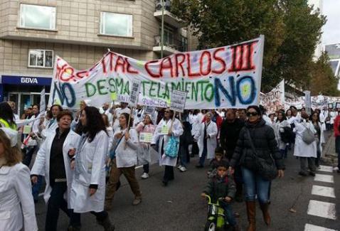 Men protesteert tegen de voorgestelde ‘privatiseringen’ of verkoop van ziekenhuizen en bezuinigingen vanuit de regionale overheid, geleid door Ignacio Gonzalez.
