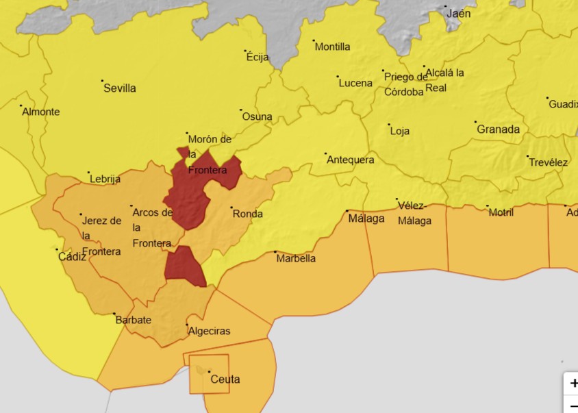 In de provincie Málaga staat de regio rond Ronda onder oranje waarschuwing. Aemet verwacht hier tot 100 liter regen in twaalf uur en mogelijk 150 liter in 24 uur. Daarmee balanceert de streek op de grens van het hoogste waarschuwingsniveau.