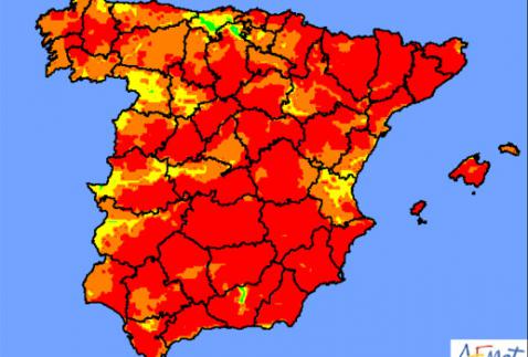 De kaart die aangeeft hoe groot het risico voor specifieke delen van Spanje is op bosbranden is op maandag op een para kleine puntjes na, compleet rood. Die kleine puntjes zijn te vinden in Cantabrië, het noorden van Burgos, het westen van Extremadura, Valencia, Castellón en bijna alle Canarische Eilanden. Hier is echter het risico op brand nog steeds aanwezig tot hoog.